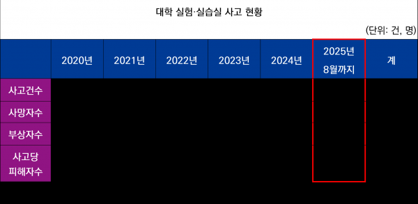교육부와 한국교육시설안전원이 국회교육위원회 김문수 의원에 제출한 자료에 따르면, 2020년부터 2025년 8월까지 대학 실험실 사고는 총 1,113건 발생했다.