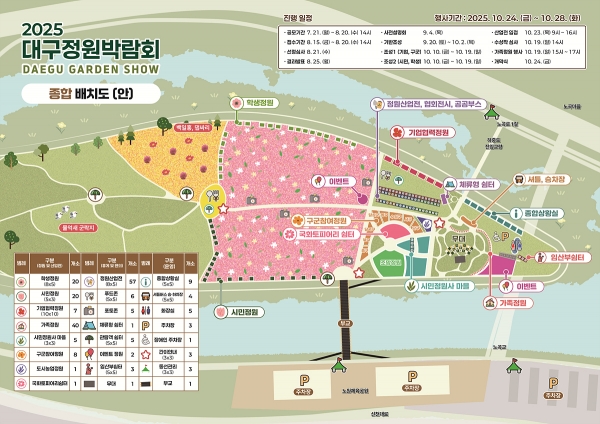 [Q뉴스] 대구광역시는 일상 속 정원문화를 확산하고 도심 속 녹색 힐링공간을 선보이는 ‘2025 대구정원박람회’를 10월 24일부터 28일까지 5일간 금호강 하중도 일원에서 개최한다.