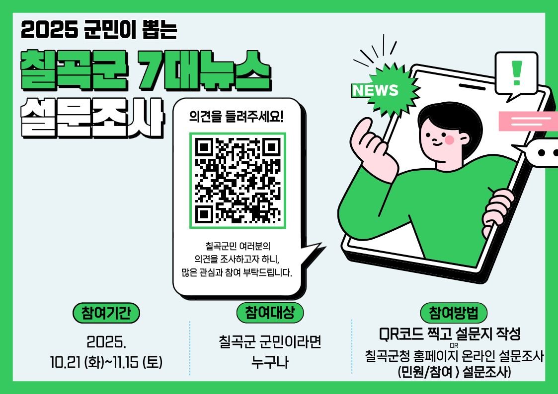 [Q뉴스] 칠곡군은 올 한 해 군정 주요 이슈 중 군민들의 관심이 컸던 ‘2025년 7대 뉴스’를 선정하기 위한 설문조사를 10월 21일부터 11월 15일까지 실시한다.