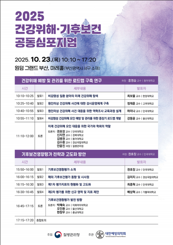 임승관 질병관리청장은 “이번 공동심포지엄을 통해 기후변화 등을 포함한 새로운 건강위험에 대한 국가 차원의 대응 방향을 심도 있게 논의할 수 있어 매우 뜻깊게 생각한다”며 “앞으로도 질병관리청은 대한예방의학회 등 관련 전문학회와 긴밀히 협력해 국민의 건강권을 보장하고 모두가 건강한 사회를 만들어 가기 위해 최선을 다하겠다”고 밝혔다.