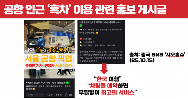 이에 직접 중국 SNS를 통해 흑차 브로커에 문의해본 결과, 흑차 브로커는 “돈만 내면 언제든 중국인 기사가 한국 내 공항-호텔 간 픽업을 중국어로 제공한다.