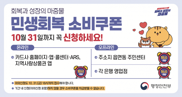 [Q뉴스] 행정안전부는 2차 민생회복 소비쿠폰의 온라인·오프라인 신청이 오는 10월 31일에 마감된다고 안내했다.