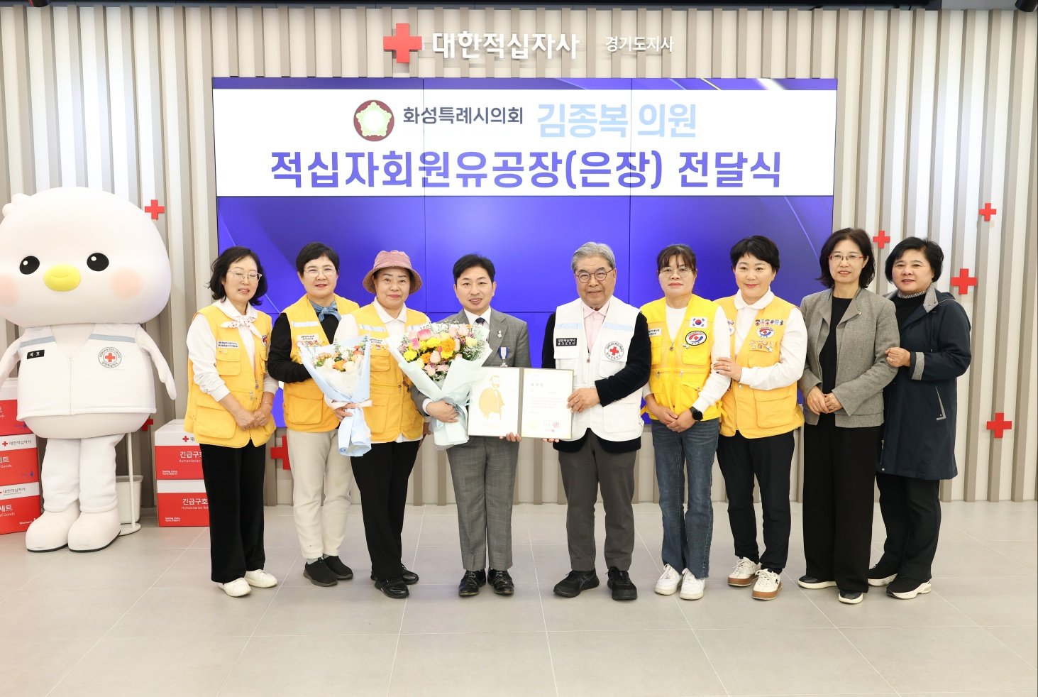 [Q뉴스] 화성특례시의회 문화복지위원회 김종복 의원(동탄4·5·6동)이 28일 대한적십자사 경기도지사(회장 이재정) 남중부봉사관에서 ‘대한적십자사 회원유공장 은장’을 수상했다.