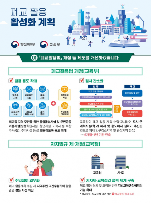 현행 ‘폐교활용법’에서 정한 교육용 시설 등 6가지 용도 외에 지역 주민을 위한 주민공동이용시설, 통합돌봄시설로도 활용되도록 ‘폐교활용법’의 용도를 추가한다.