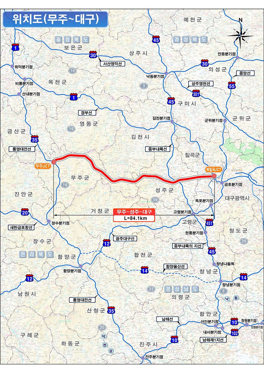 ‘무주–대구 고속도로’는 전북 무주-경북 성주-대구를 잇는 국가도로망 동서 3축(새만금-무주-대구-포항)의 핵심 구간으로 총 연장 84.1km에 총사업비 6조 4,000억원이 투입된다.