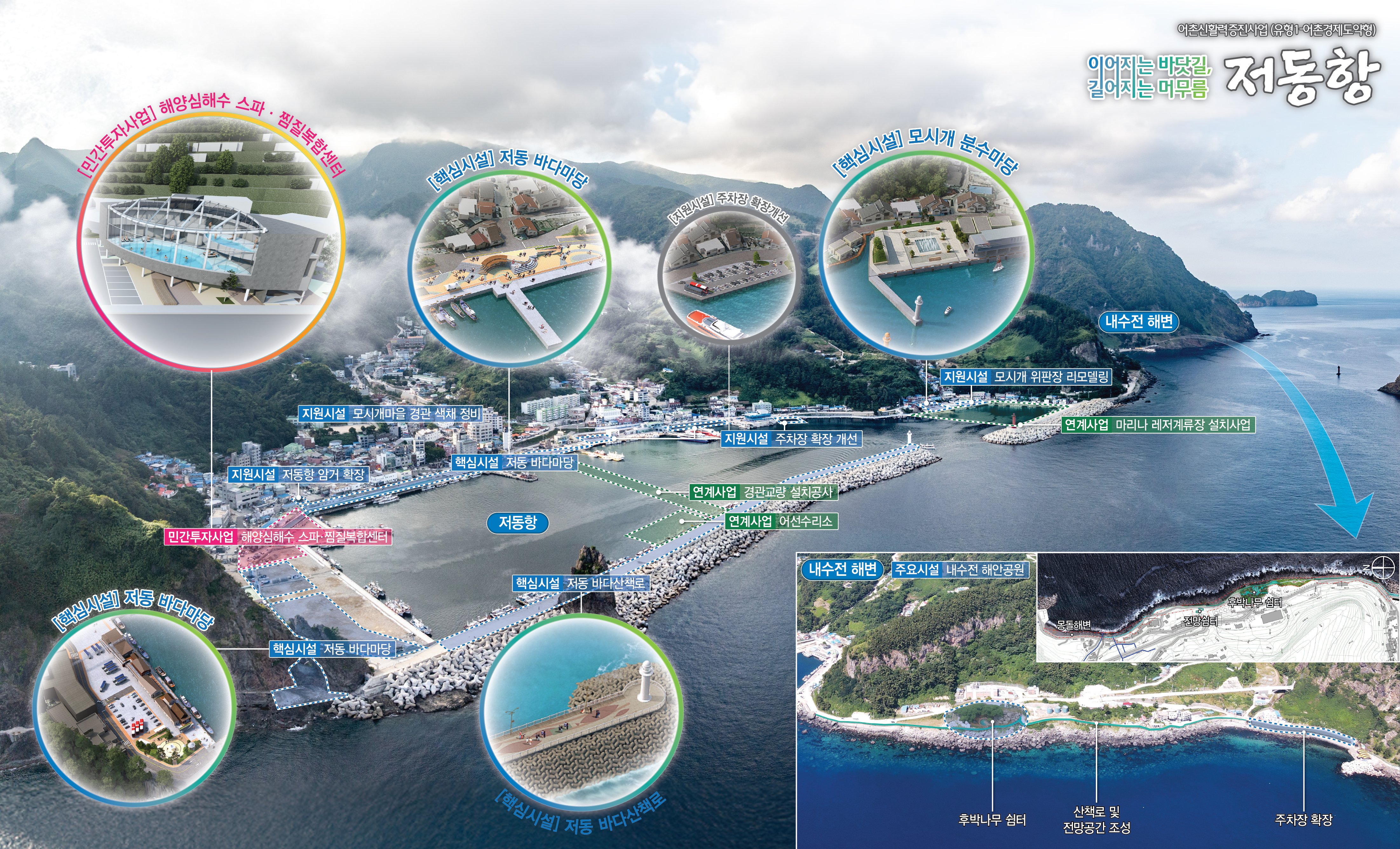 사업 대상지는 저동항에서 내수전 일원으로‘저동 바다마당’, ‘바다산책로’, ‘모시개 분수마당’, ‘내수전 해안공원’등 어촌·어항 관광기반시설을 확충해 지역민과 관광객이 함께 즐길 수 있는 복합 해양공간으로 조성될 예정이다.