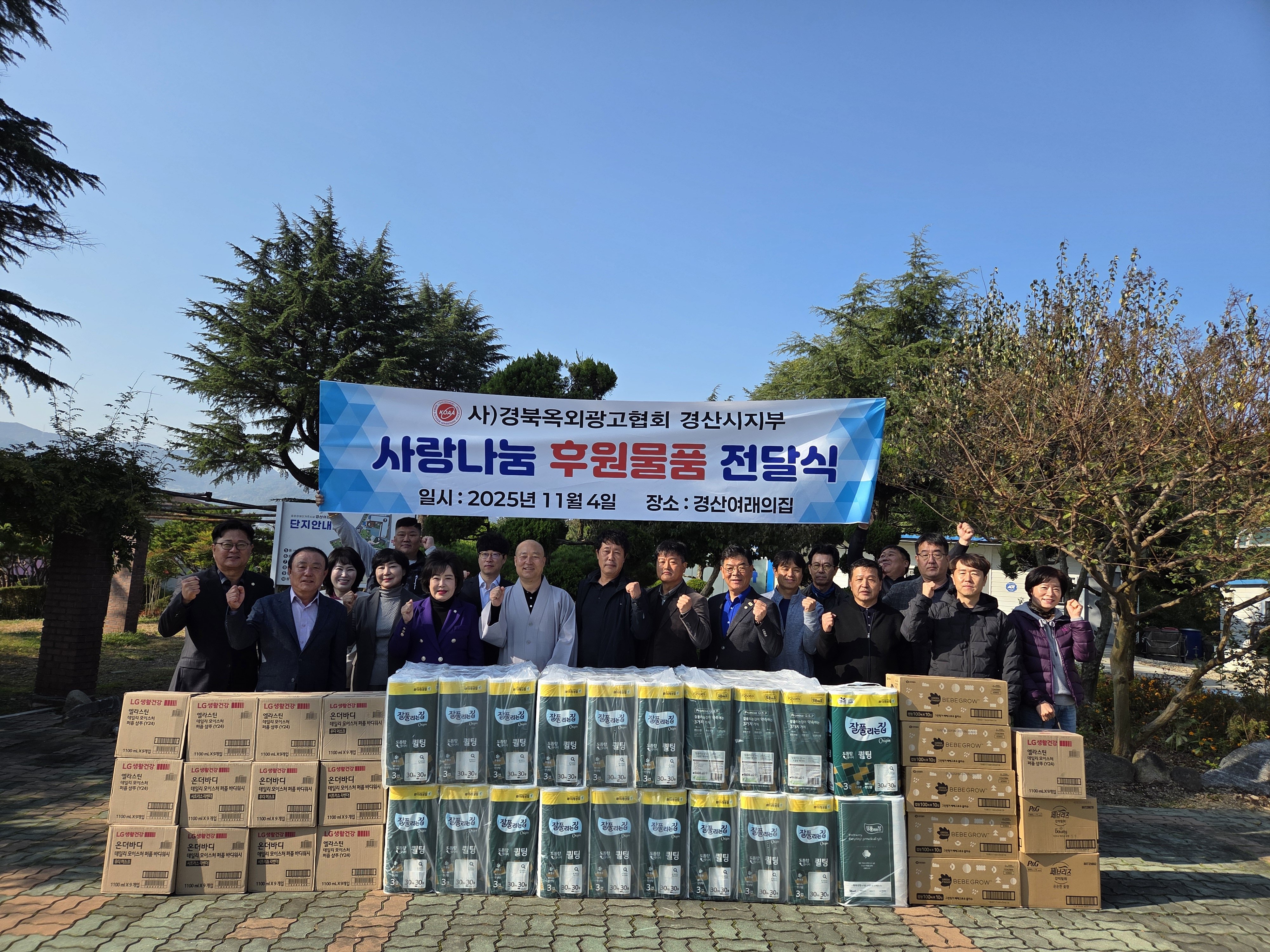 [Q뉴스] 사단법인 경북옥외광고협회 경산시지부는 4일 경산여래의 집과 경산시노인복지회관을 방문해 경산시의회 의원들이 참석한 가운데 백미 10kg 40포와 휴지, 샴푸 등 시가 250만원 상당을 각각 2개소에 전달식을 가졌다.
