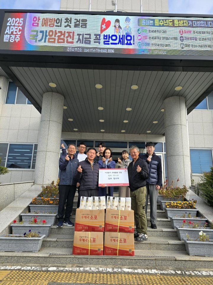 [Q뉴스] 감포청우회가 지난 7일 감포읍 행정복지센터를 방문해 지역 내 취약계층에 전달을 희망하며 잡곡 250포를 기탁했다.