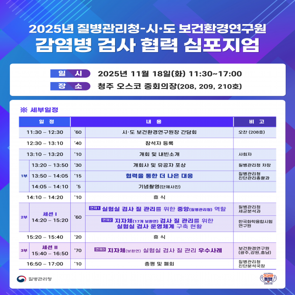 아울러 “이번 심포지엄을 통해 감염병 실험실 검사 분야의 모범적인 사례를 공유하고 현장의 의견을 반영해 국가와 지자체 간 협력 기반을 더욱 공고히 함으로써, 국가 감염병 검사가 한 단계 도약하는 계기가 되길 기대한다”고 밝혔다.