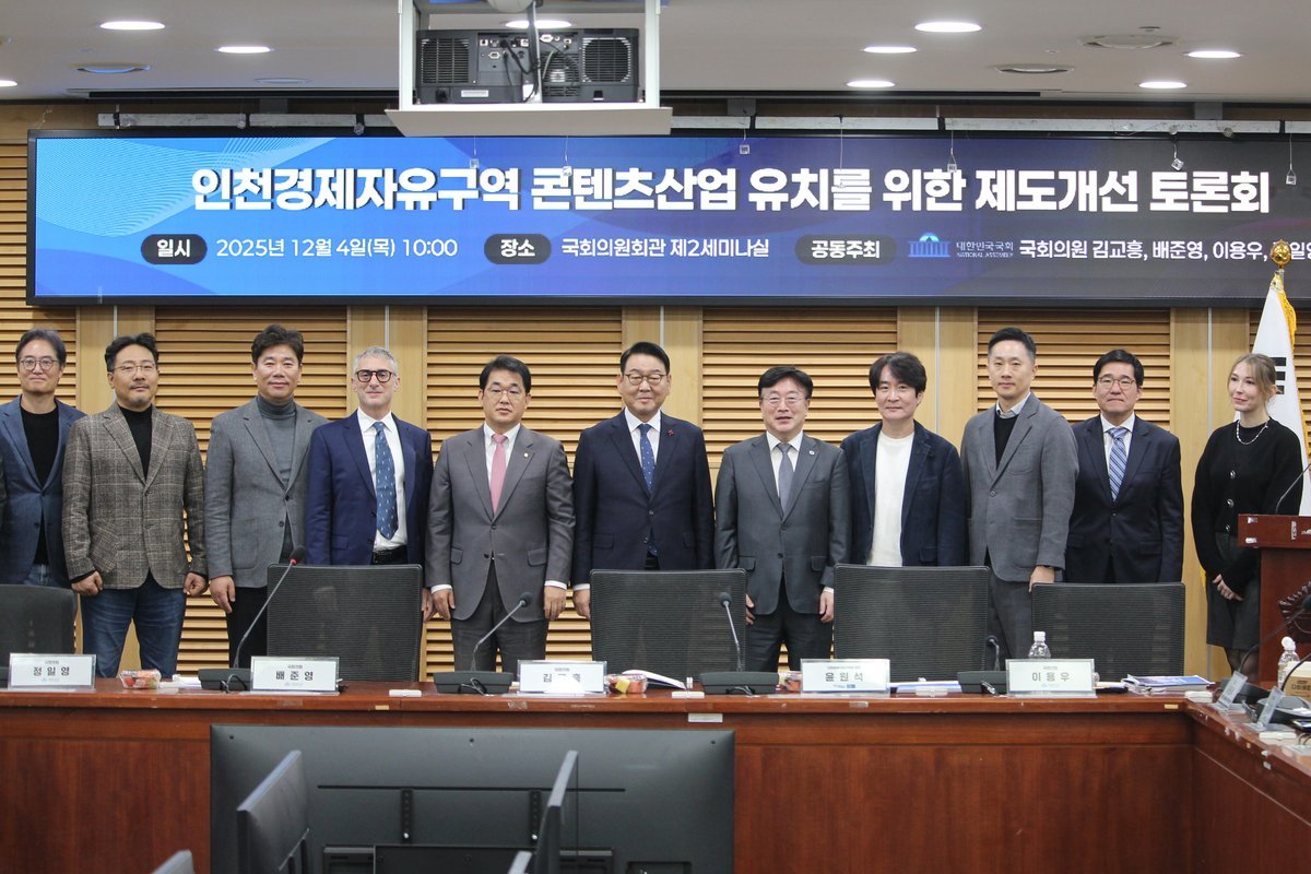 [Q뉴스] 더불어민주당 국회 문화체육관광위원장 김교흥 국회의원은 4일 국회의원회관 제2세미나실에서 배준영 의원, 이용우 의원, 정일영 의원과 함께 ‘인천경제자유구역 콘텐츠산업 유치를 위한 제도개선’토론회를 열었다고 밝혔다.