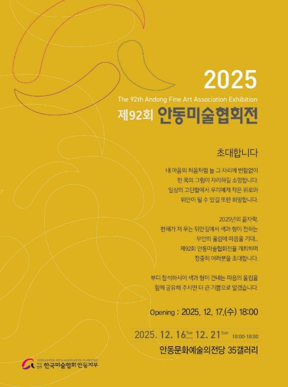 이번 안동미술협회전은 50년 역사를 자랑하는 한국미술협회 안동지부의 정기전으로, 지역 문화예술의 소통과 발전을 볼 수 있는 기회며 현대미술의 흐름을 직․간접적으로 느낄 수 있다.