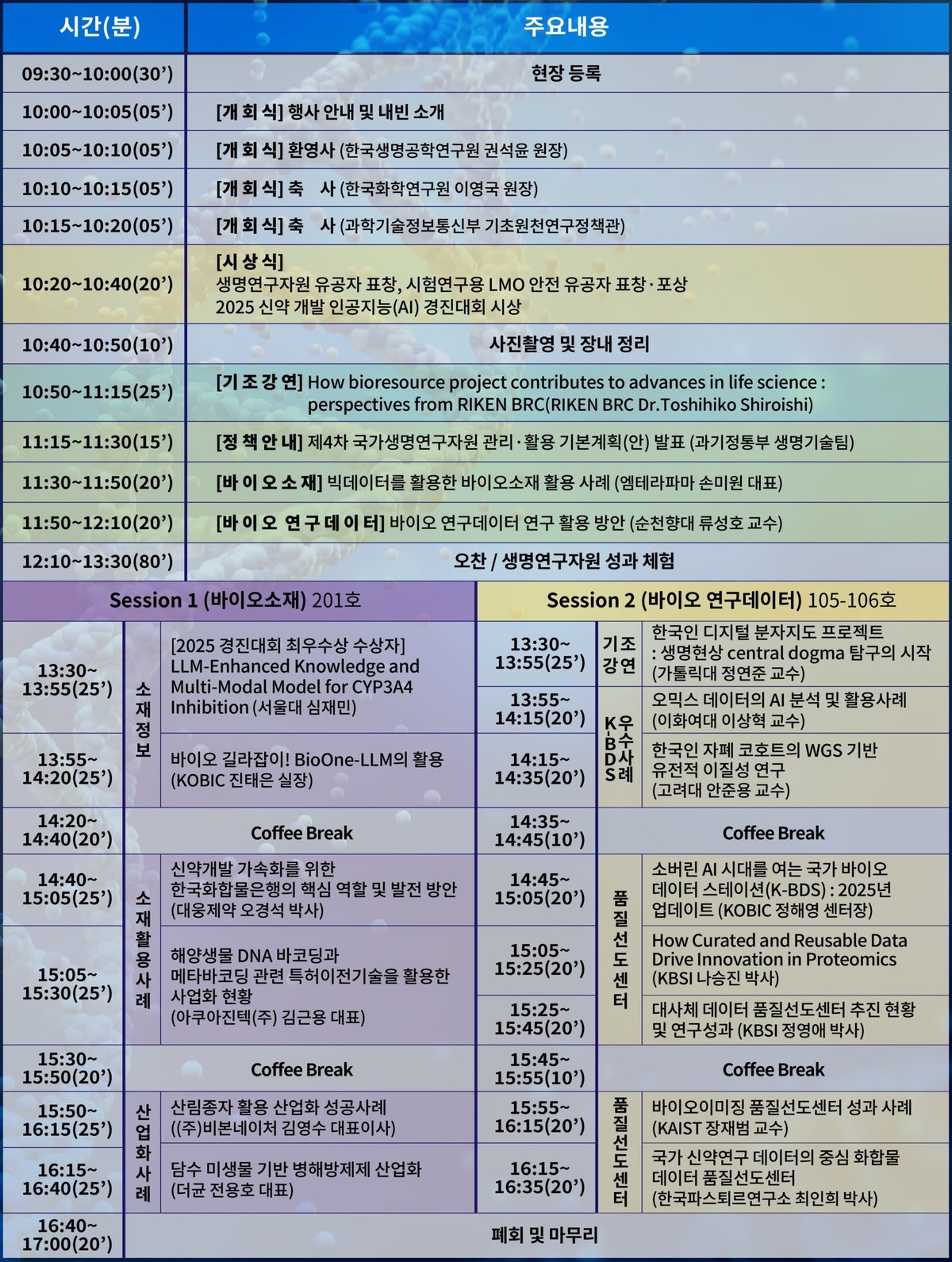 이번 행사는 그동안 분리 운영되던 바이오소재 성과교류회와 바이오데이터성과교류회를 통합해 개최되며, △바이오소재·데이터 기반의 연구성과 전시*와, △생명연구자원 정책·연구·산업 연계를 논의하는 포럼으로 구성된다.