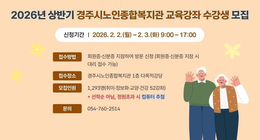 신청 기간은 2월 2일부터 3일까지 이틀간, 오전 9시부터 오후 5시까지이며 경주시노인종합복지관 1층 다목적강당에서 방문 접수로만 진행된다.