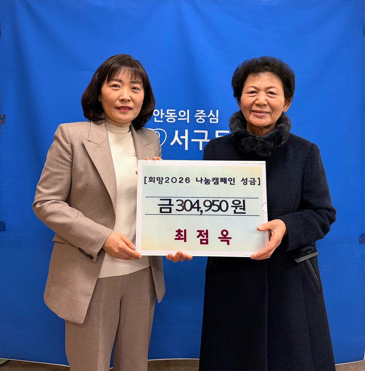 [Q뉴스] 안동시 서구동에 거주하는 최점옥 어르신은 어려운 이웃과 함께 나누고자 1월 26일 서구동행정복지센터를 방문해 3000여 개의 빈 병을 수거해 모은 성금 30만4950원을 희망2026 나눔캠페인 성금으로 기탁했다.