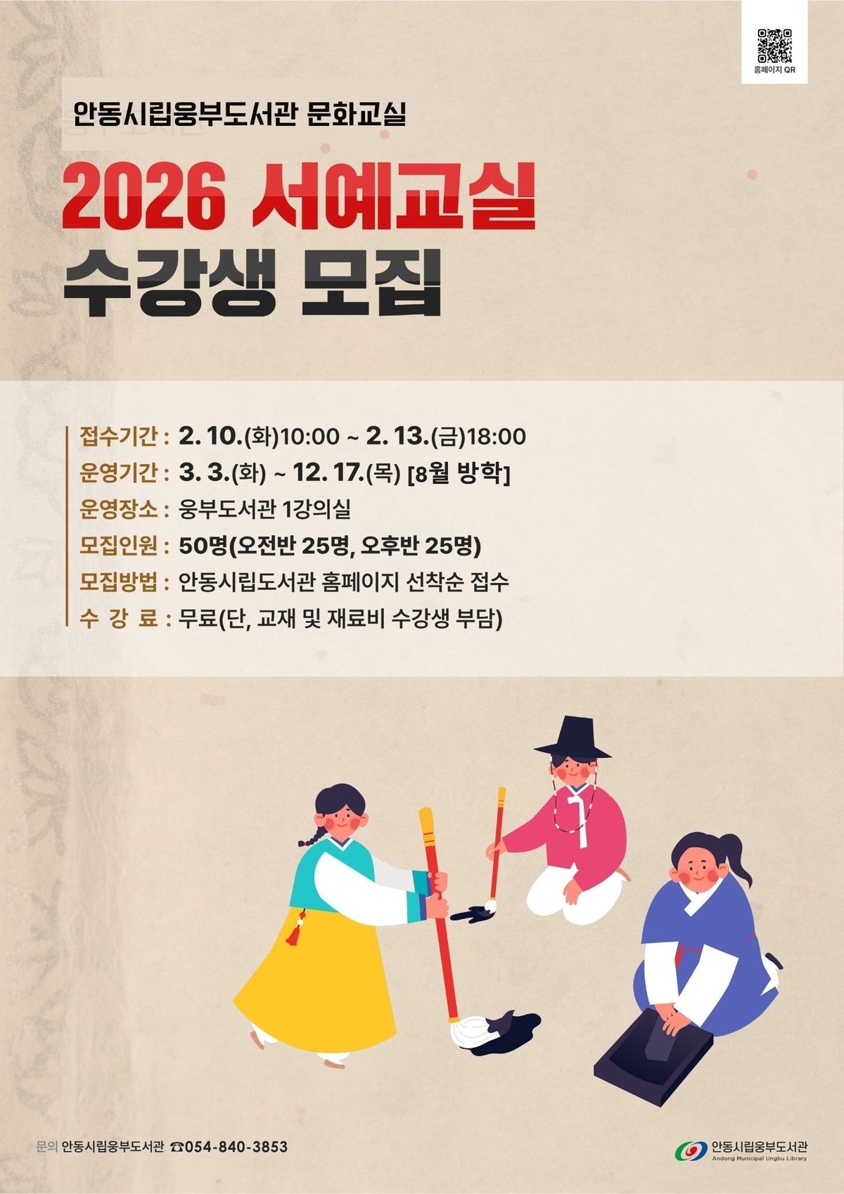 [Q뉴스] 안동시립웅부도서관은 오는 2월 10일부터 13일까지 나흘간 문화교실 ‘서예 강좌’신입회원을 모집한다.