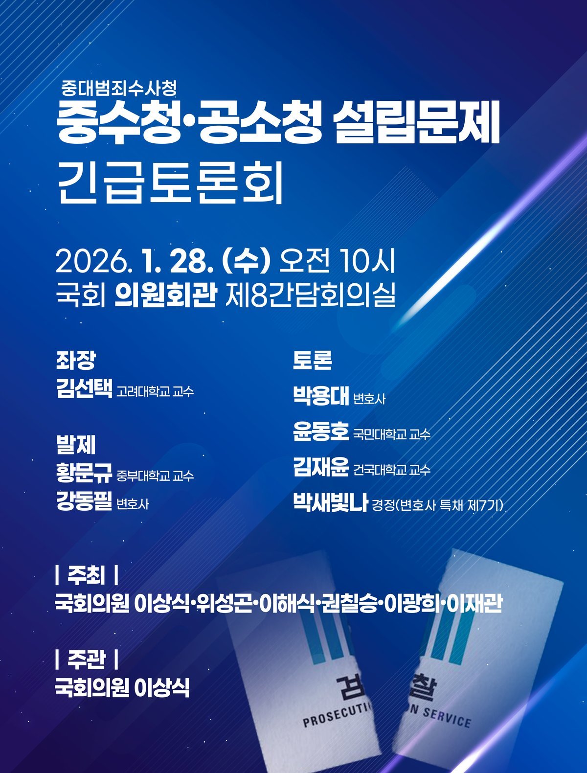 이번 토론회는 위성곤, 이해식, 권칠승, 이광희, 이재관 의원이 공동주최로 참여하며 2026년 10월로 예정된 검찰청 폐지와 중대범죄수사청, 공소청 신설을 앞두고 올바른 입법 방향을 모색하기 위해 마련됐다.