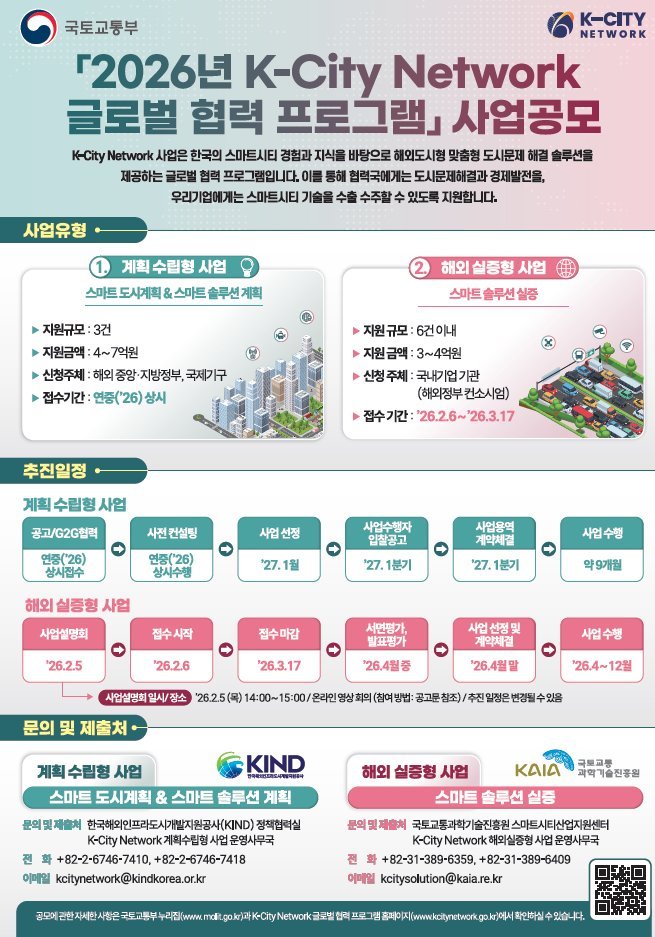 [Q뉴스] 정부가 국내 스마트도시 기술의 해외 진출을 지원하기 위해 올해「K-City 네트워크 글로벌 협력 사업*」 공모를 추진한다. 이번 사업을 통해 기업들은 해외 도시에서 자사 기술을 직접 실증하고, 현지 여건에 맞는 사업 모델을 검증해 실제 수주와 사업화로 이어질 수 있는 기회를 얻게 된다.