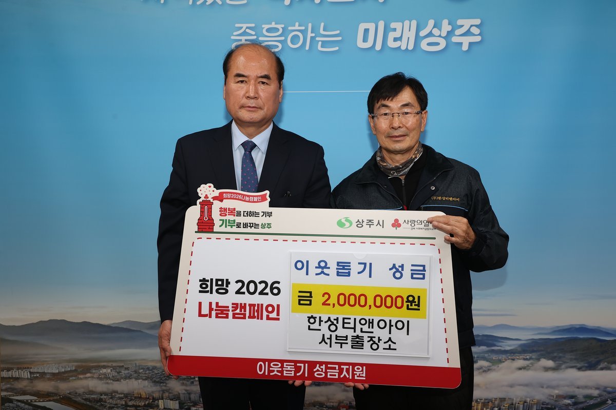 [Q뉴스] 상주시 소재 한성티앤아이 서부출장소는 1월 27일 상주시청 시민의 방을 방문해 어려운 이웃을 돕기 위한 성금 200만원을 기탁하며 따뜻한 나눔을 실천했다.