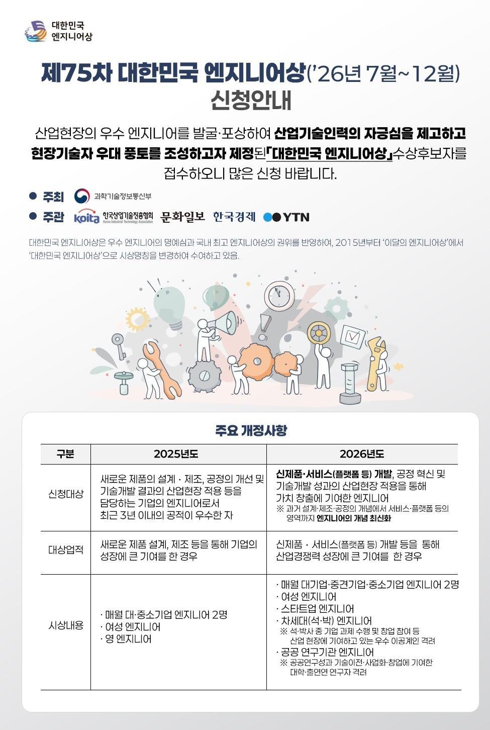 [Q뉴스] 과학기술정보통신부와 한국산업기술진흥협회는 과기정통부와 산기협 누리집에 제75차 ‘대한민국 엔지니어 상’ 선정계획을 1월 26일에 공고했다.