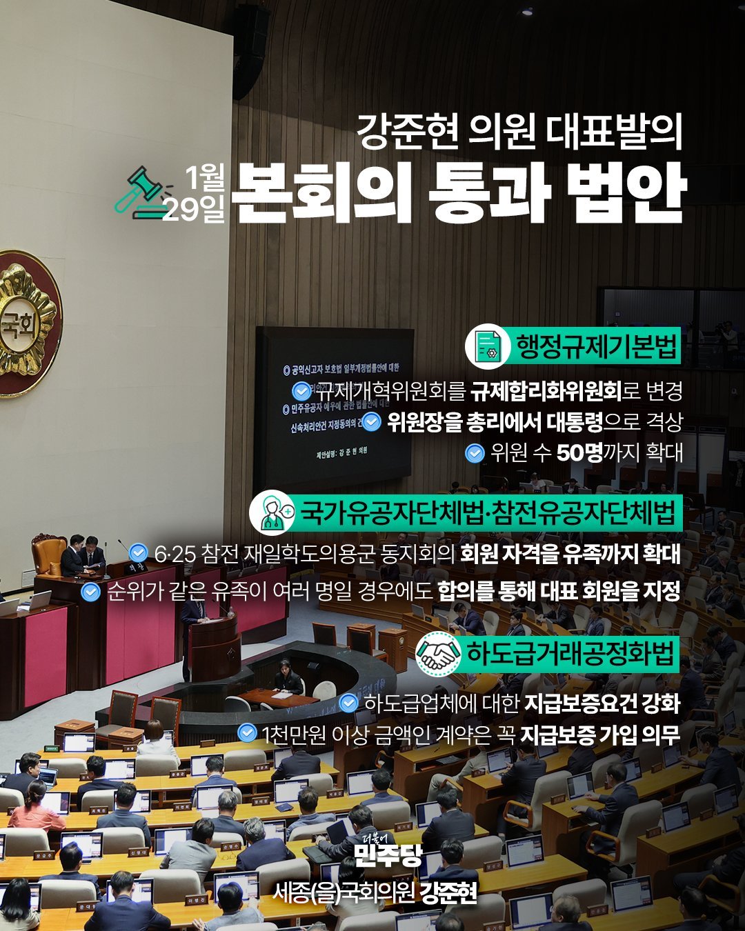 [Q뉴스] 더불어민주당 강준현 국회의원이 대표발의한 4건의 법률안이 29일 국회 본회의를 통과하며 민생경제 보호, 공정한 규제 거버넌스 구축, 국가유공자 예우 강화를 위한 제도 개선에 본격적인 전기를 마련했다.