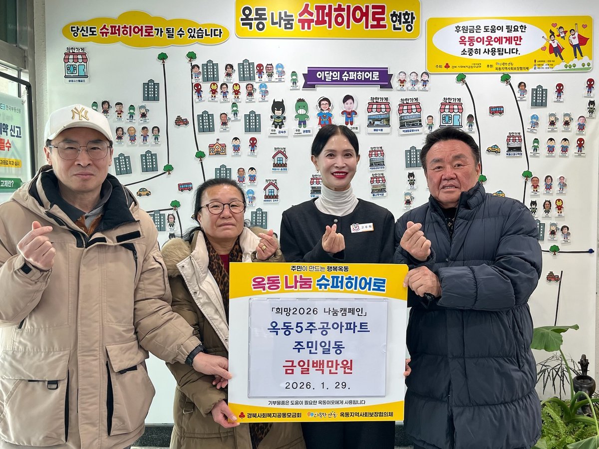 [Q뉴스] 안동시 옥동 5주공아파트 주민 일동이 소외된 이웃들을 위해 사용해 달라며 1월 29일 희망2026 나눔캠페인에 성금 100만원을 기탁했다.