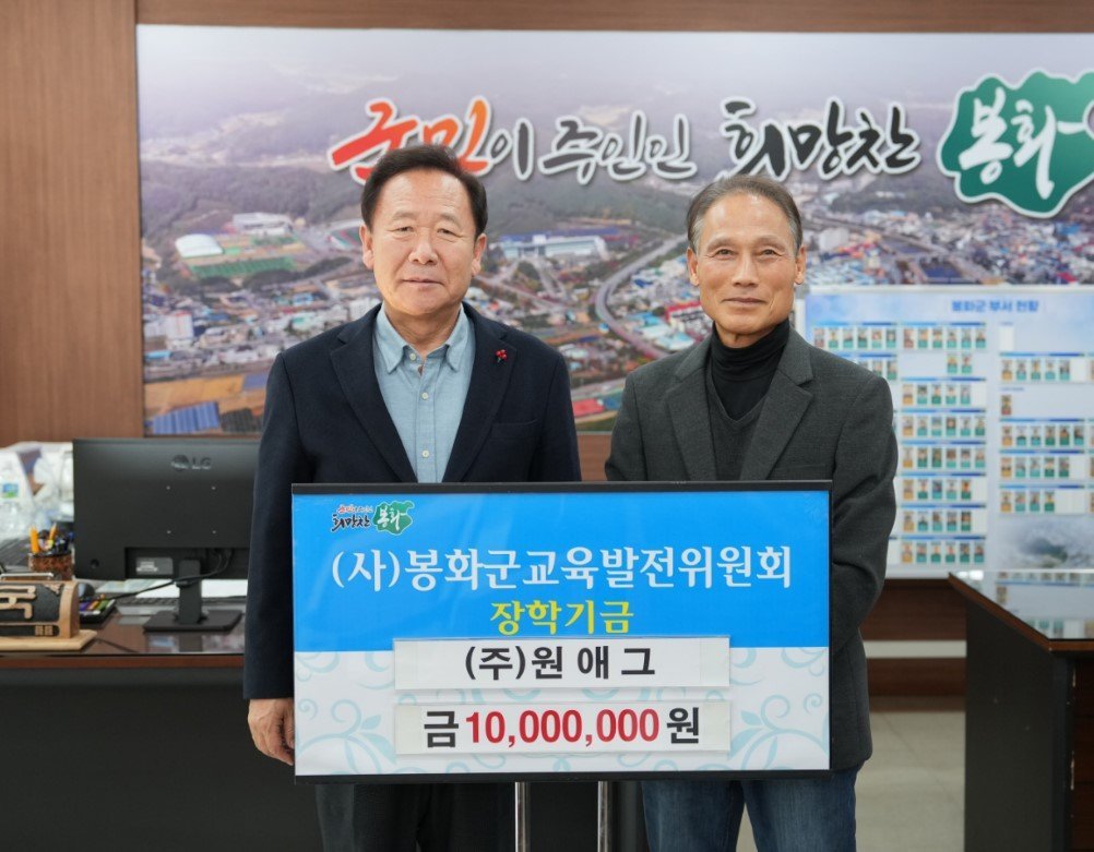 [Q뉴스] 봉화군에 소재한 ㈜원애그는 2월 4일 봉화군청을 방문해 지역 교육발전과 인재 육성을 위해 봉화군교육발전위원회에 장학금 1천만원을 기탁했다.
