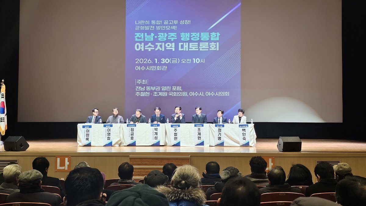 [Q뉴스] 주철현·조계원 국회의원은 여수시, 여수시의회, 전남동부권 열린포럼과 함께 '전남·광주 행정통합 여수지역 대토론회'를 30일 여수시민회관에서 공동 개최하고 전남 동부권의 주요 현안과 행정통합 방향을 놓고 시민 의견을 수렴했다.