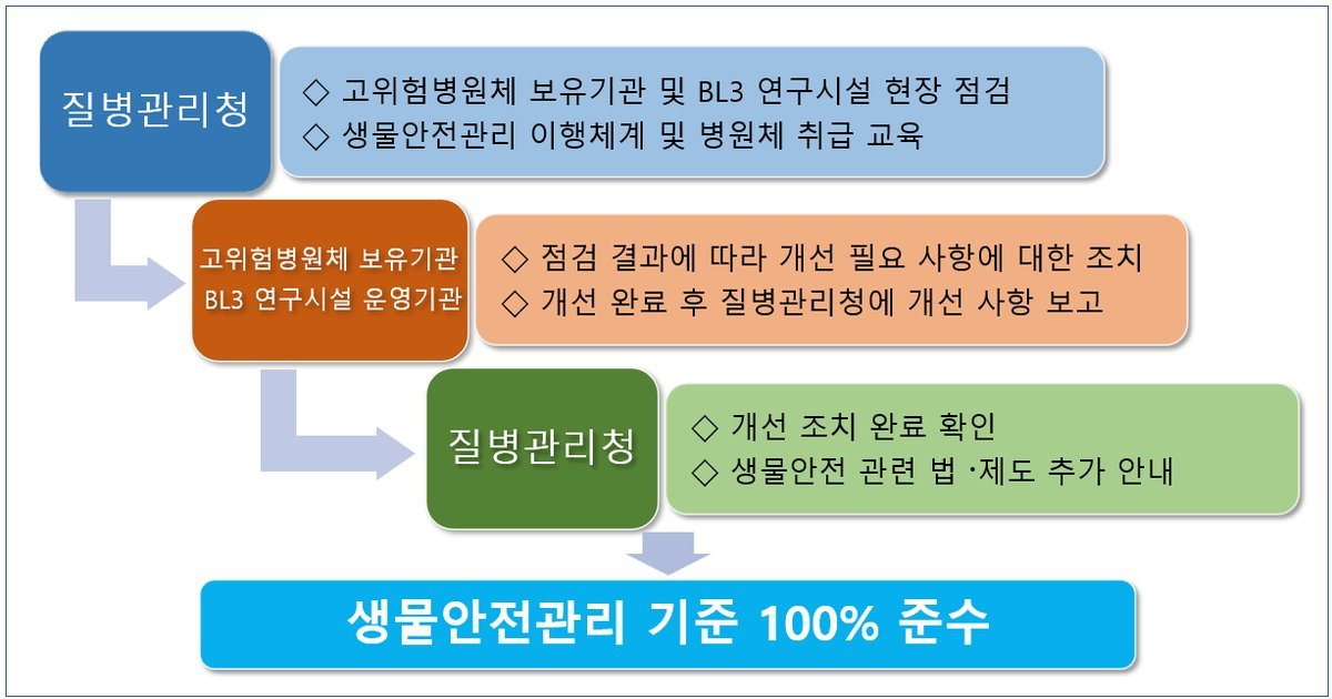 질병관리청은 이번 점검 결과를 바탕으로 바이오 연구‧산업 현장의 생물안전 문화를 더욱 확산시키기 위해 사전 예방 중심의 관리와 생물안전 교육 지원을 지속적으로 강화할 예정이다.