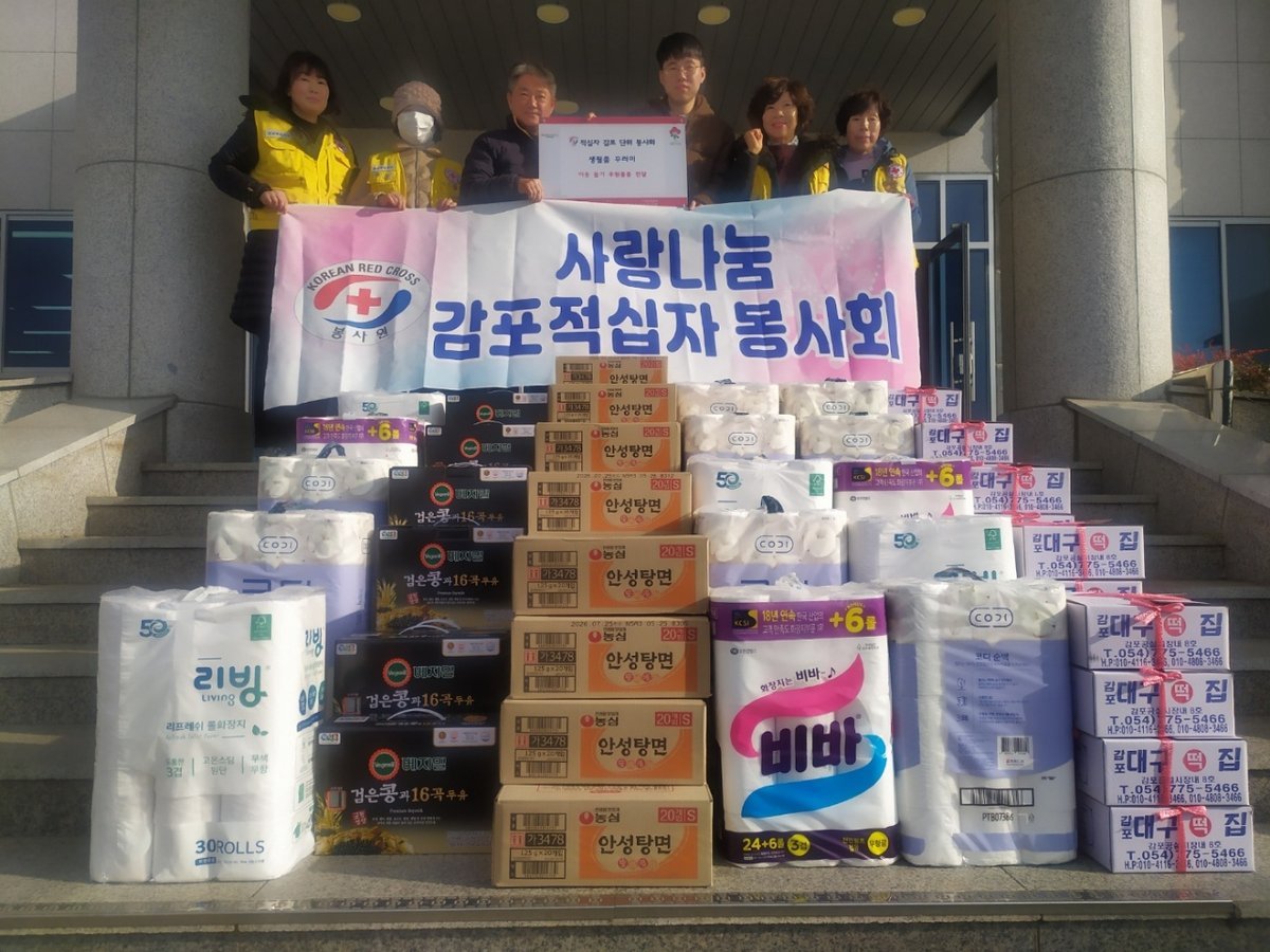 [Q뉴스] 적십자감포단위봉사회는 설날을 맞아 지난 4일 관내 복지사각지대에 놓인 생활형편이 어려운 20여 가구를 대상으로 떡과 라면, 두유, 화장지 등 150만원 상당의 생필품을 전달했다.