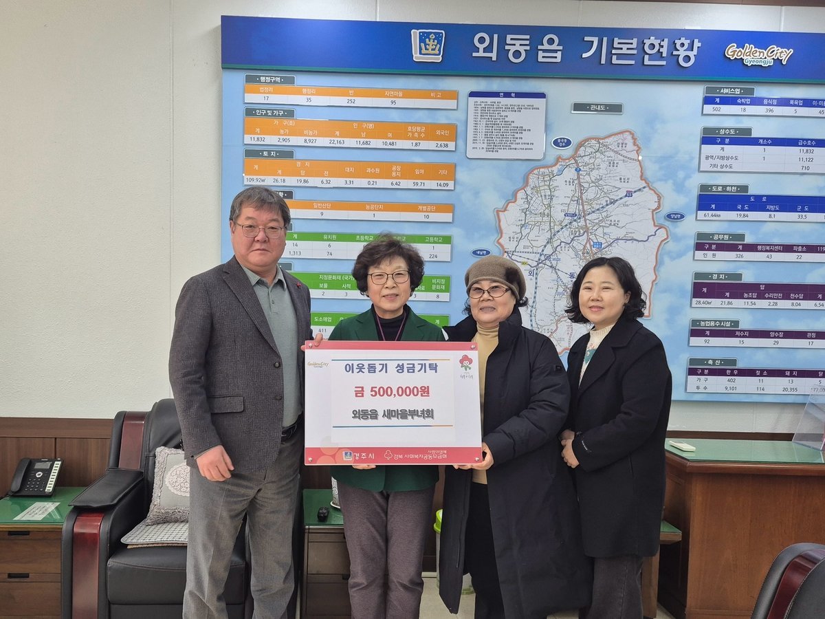 여동형 외동읍장은 “지역사회를 위해 꾸준히 힘을 모아 주시는 새마을부녀회 회원들에게 감사드리며 따뜻한 마음이 담긴 성금을 꼭 필요한 이웃에게 잘 전달하겠다”고 감사의 인사를 전했다.